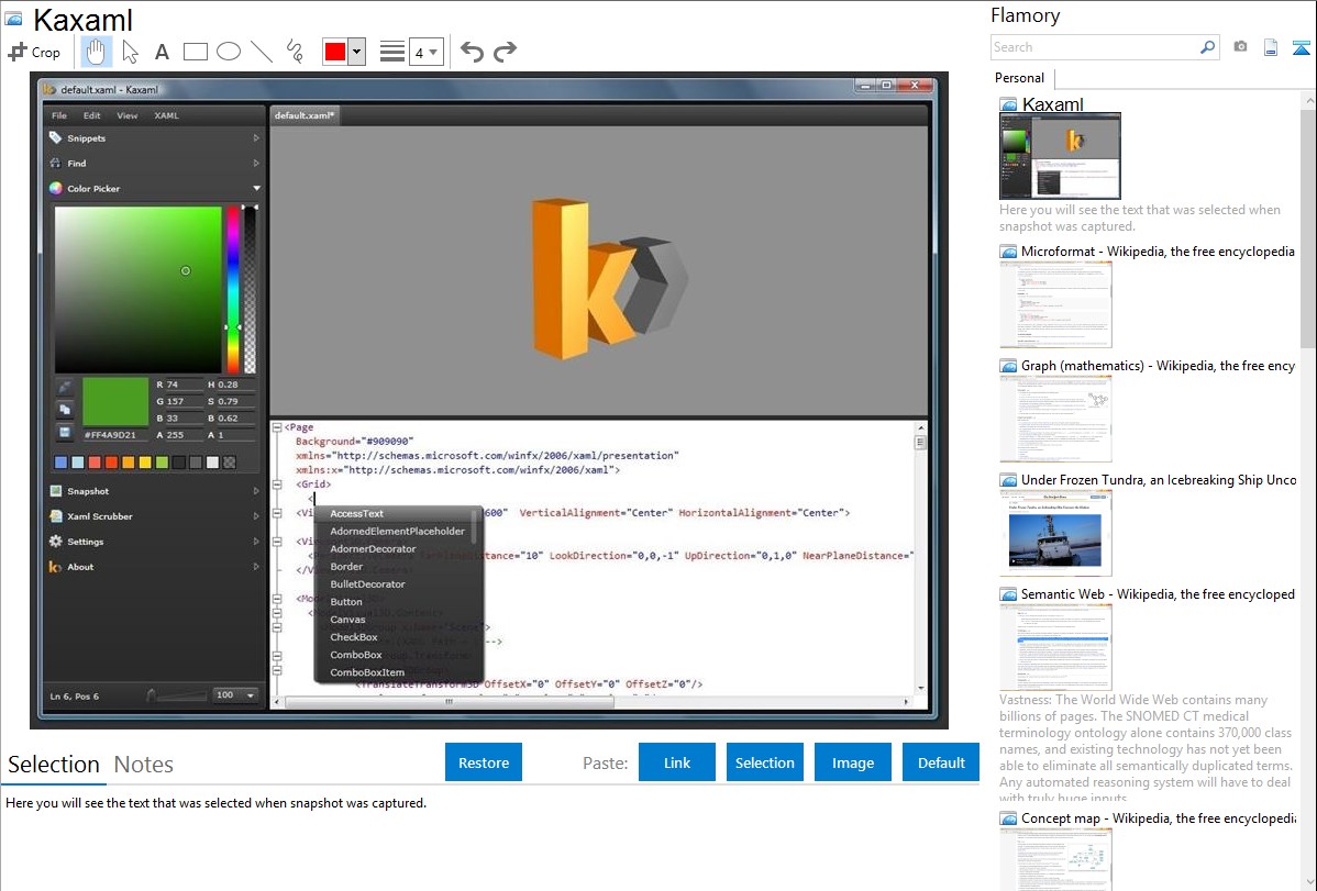 Flamory provides advanced bookmarking for Kaxaml. It captures screen, selection, text of the document and other context. You can find this bookmark later using search by document content or looking through thumbnail list.