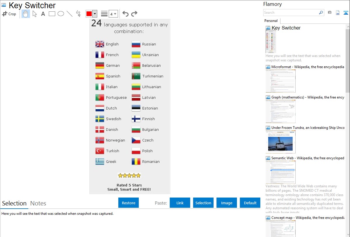 Flamory helps you capture and store screenshots from Key Switcher by pressing a single hotkey. It will be saved to a history, so you can continue doing your tasks without interruptions. Later, you can edit the screenshot: crop, resize, add labels and highlights. After that, you can paste the screenshot into any other document or e-mail message.
