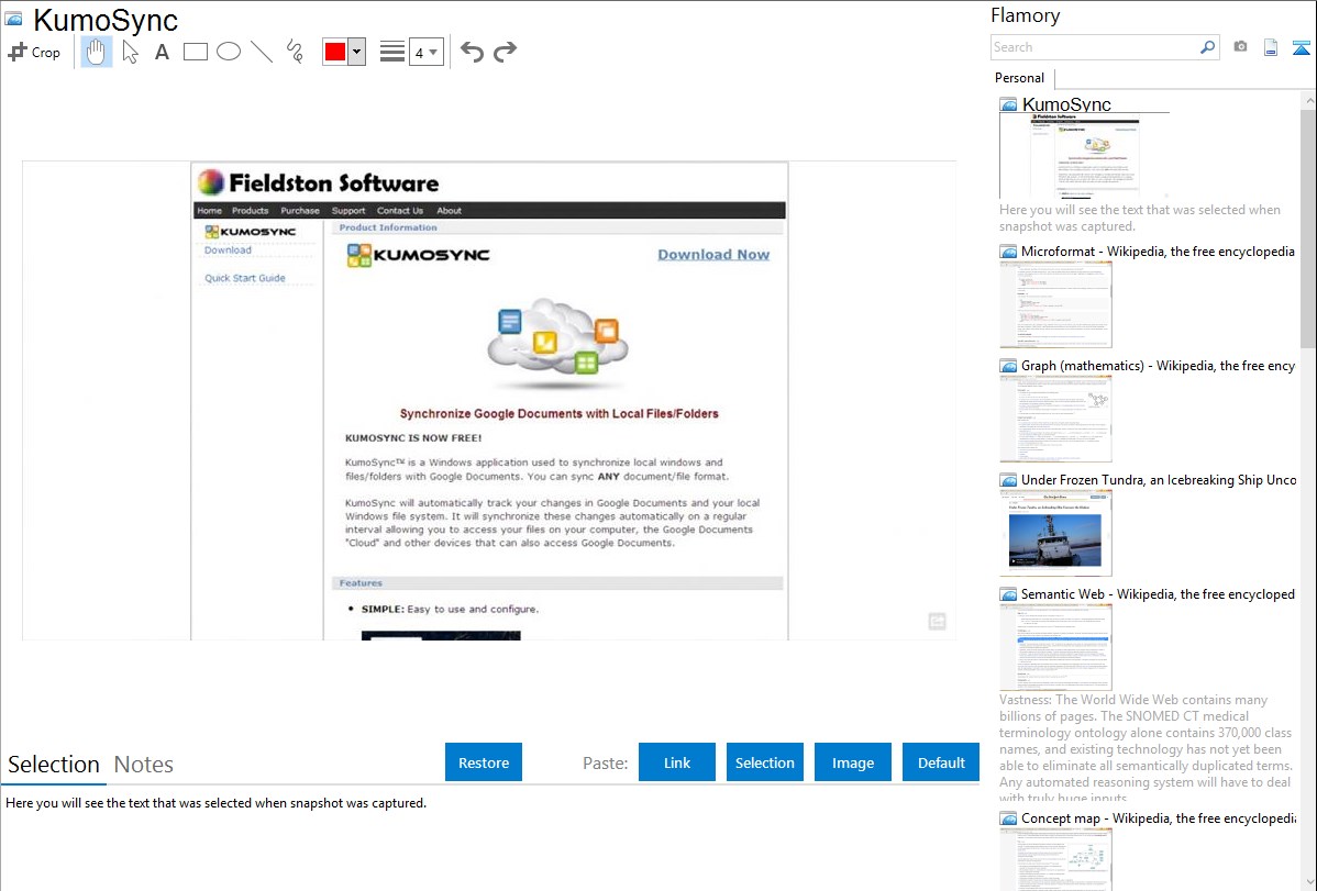 Flamory helps you capture and store screenshots from KumoSync by pressing a single hotkey. It will be saved to a history, so you can continue doing your tasks without interruptions. Later, you can edit the screenshot: crop, resize, add labels and highlights. After that, you can paste the screenshot into any other document or e-mail message.