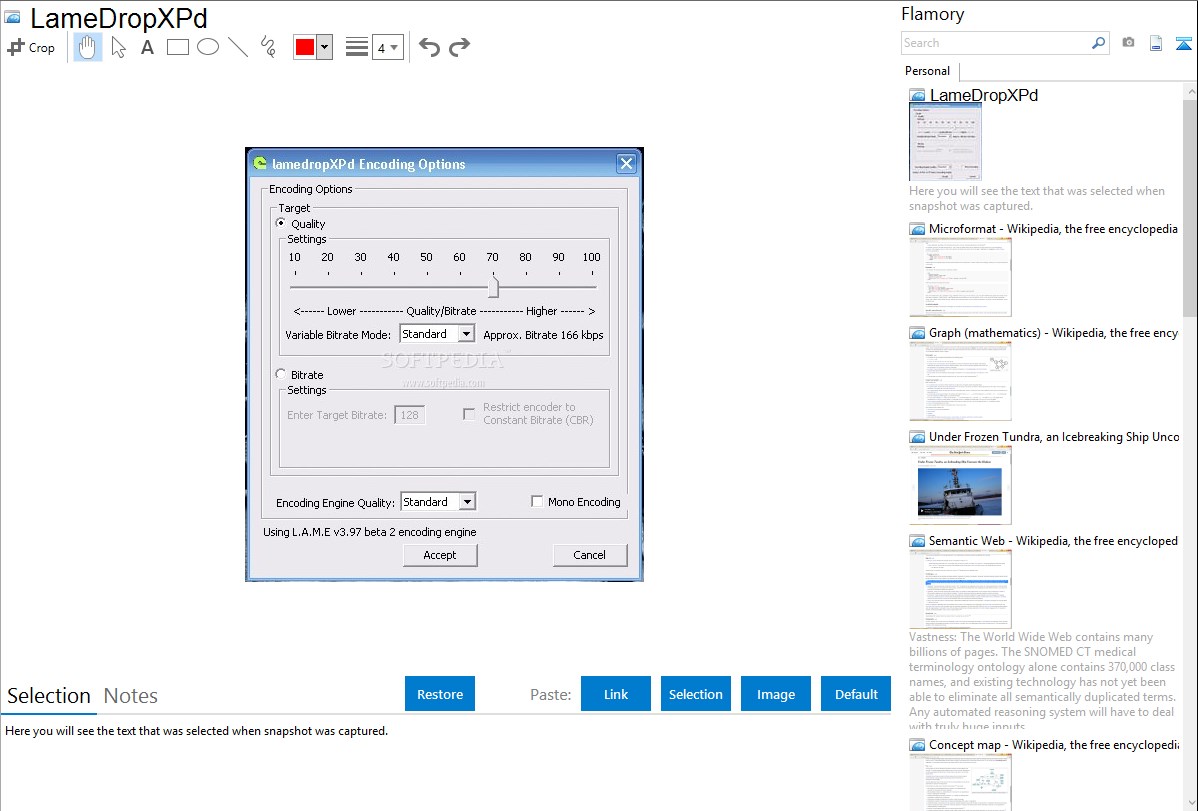 Flamory helps you capture and store screenshots from LameDropXPd by pressing a single hotkey. It will be saved to a history, so you can continue doing your tasks without interruptions. Later, you can edit the screenshot: crop, resize, add labels and highlights. After that, you can paste the screenshot into any other document or e-mail message.