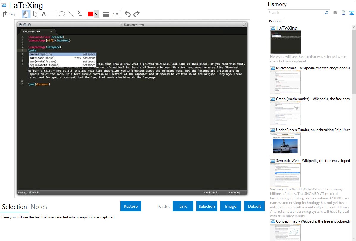 Flamory helps you capture and store screenshots from LaTeXing by pressing a single hotkey. It will be saved to a history, so you can continue doing your tasks without interruptions. Later, you can edit the screenshot: crop, resize, add labels and highlights. After that, you can paste the screenshot into any other document or e-mail message.