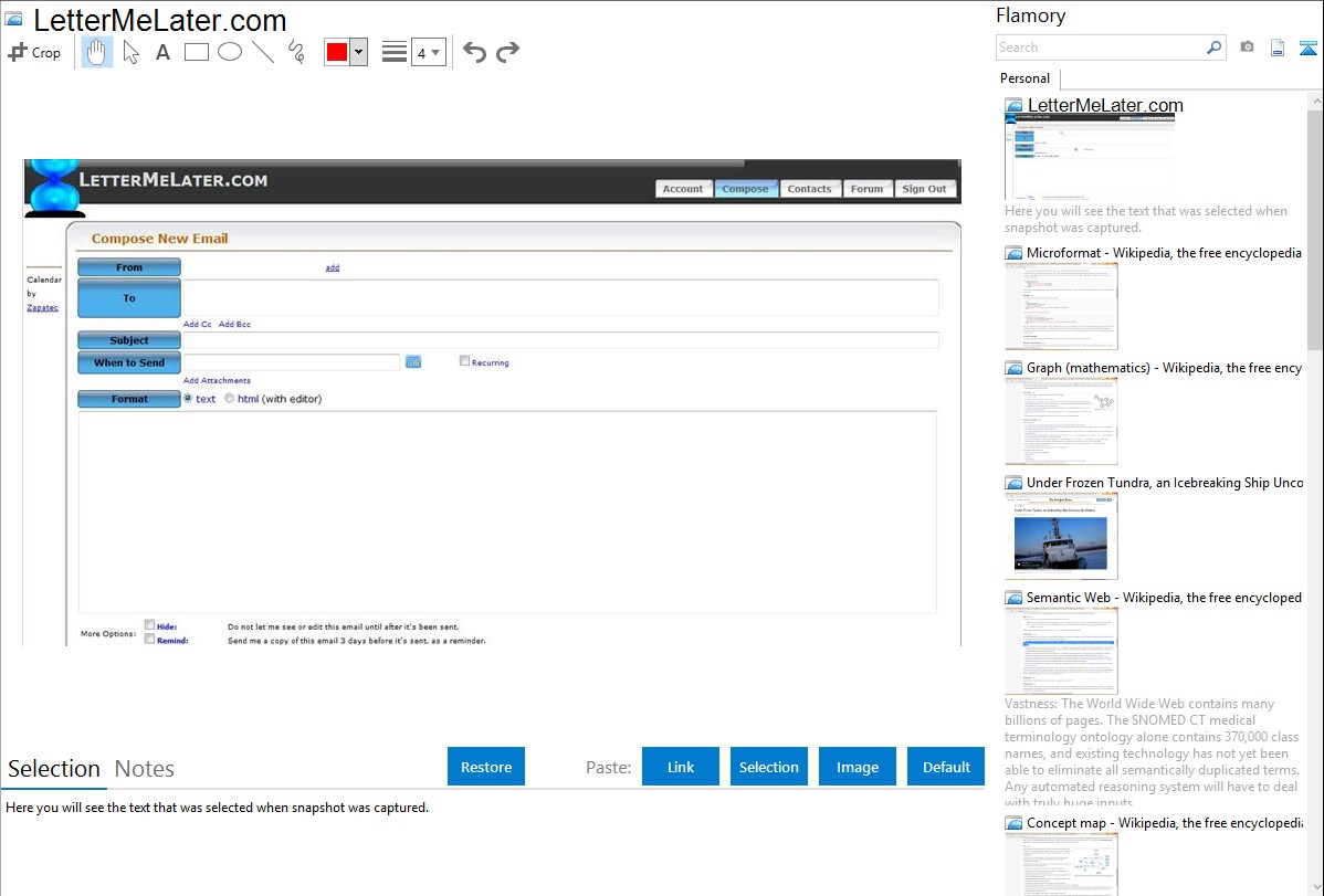 Flamory helps you capture and store screenshots from LetterMeLater.com by pressing a single hotkey. It will be saved to a history, so you can continue doing your tasks without interruptions. Later, you can edit the screenshot: crop, resize, add labels and highlights. After that, you can paste the screenshot into any other document or e-mail message.