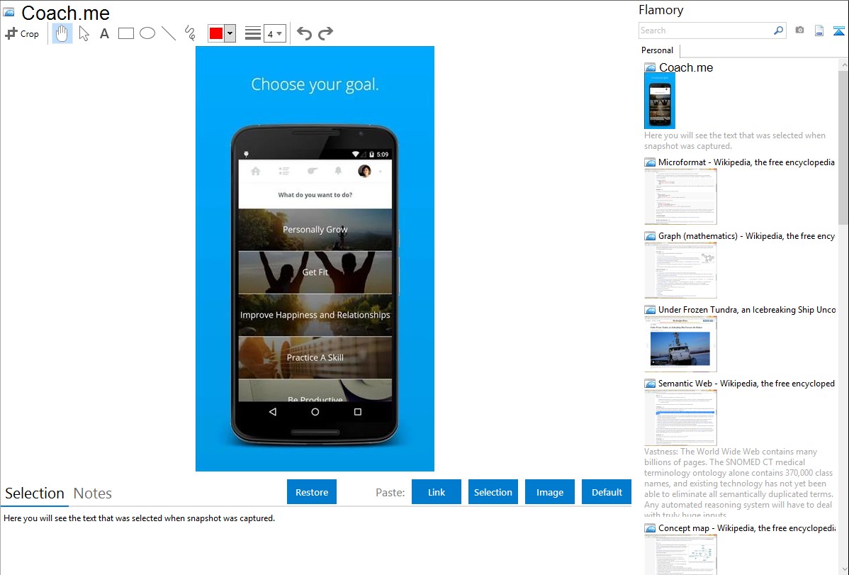 Flamory helps you capture and store screenshots from Coach.me by pressing a single hotkey. It will be saved to a history, so you can continue doing your tasks without interruptions. Later, you can edit the screenshot: crop, resize, add labels and highlights. After that, you can paste the screenshot into any other document or e-mail message.