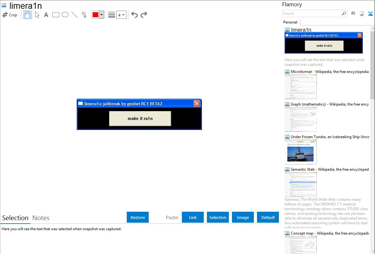 Flamory helps you capture and store screenshots from limera1n by pressing a single hotkey. It will be saved to a history, so you can continue doing your tasks without interruptions. Later, you can edit the screenshot: crop, resize, add labels and highlights. After that, you can paste the screenshot into any other document or e-mail message.
