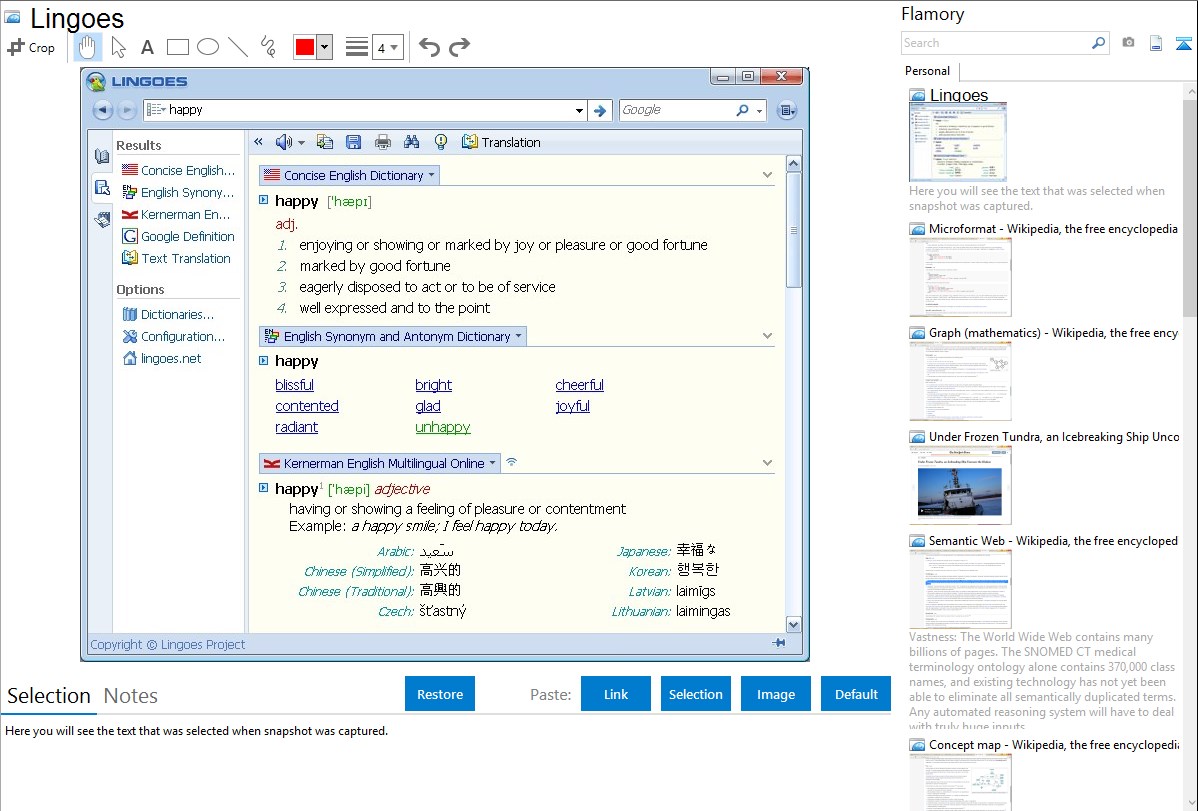 Flamory helps you capture and store screenshots from Lingoes by pressing a single hotkey. It will be saved to a history, so you can continue doing your tasks without interruptions. Later, you can edit the screenshot: crop, resize, add labels and highlights. After that, you can paste the screenshot into any other document or e-mail message.