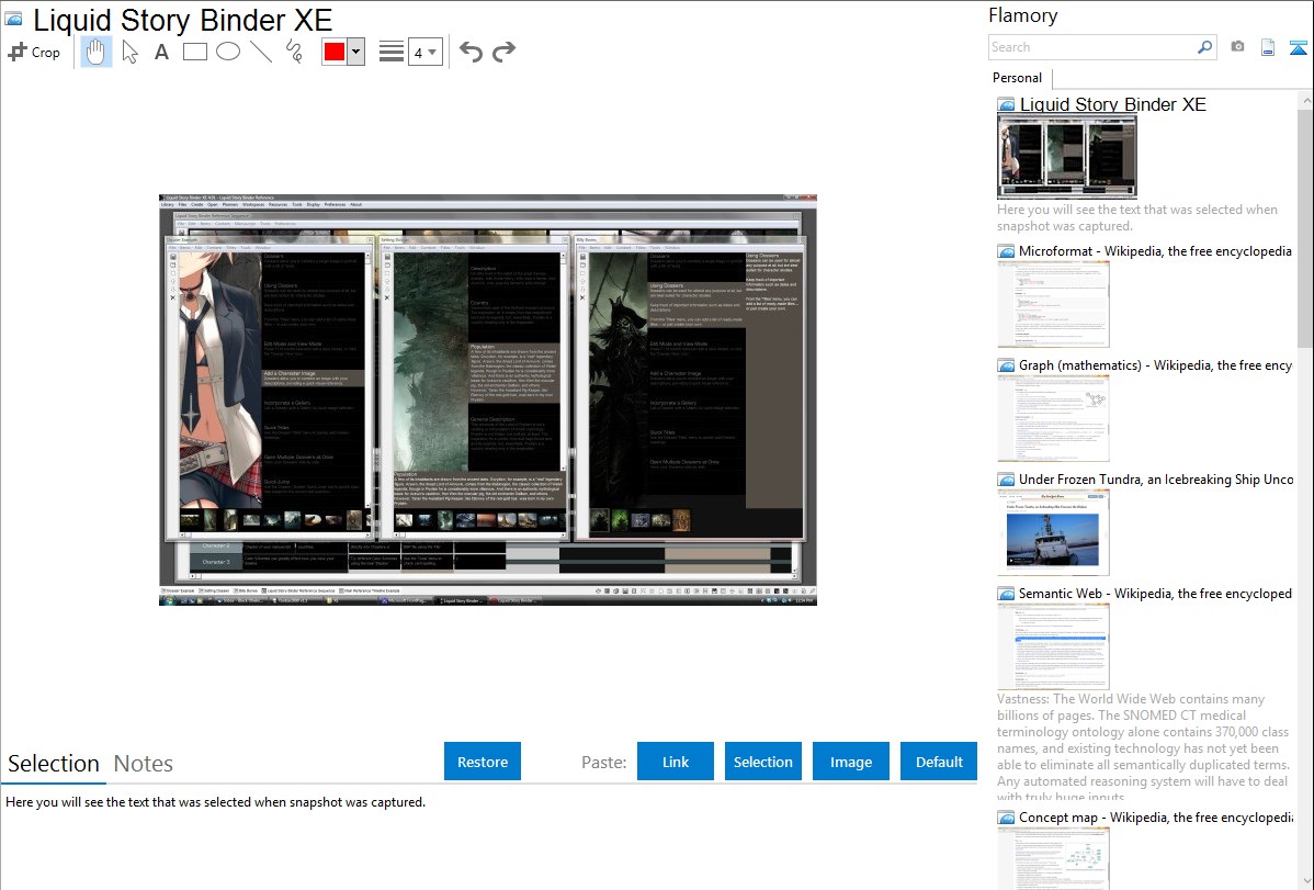 Flamory helps you capture and store screenshots from Liquid Story Binder XE by pressing a single hotkey. It will be saved to a history, so you can continue doing your tasks without interruptions. Later, you can edit the screenshot: crop, resize, add labels and highlights. After that, you can paste the screenshot into any other document or e-mail message.