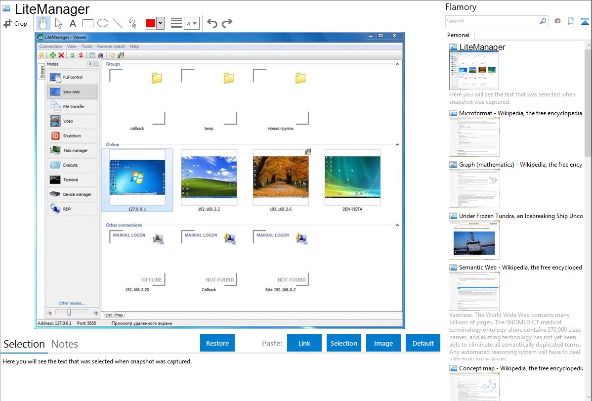 Flamory helps you capture and store screenshots from LiteManager by pressing a single hotkey. It will be saved to a history, so you can continue doing your tasks without interruptions. Later, you can edit the screenshot: crop, resize, add labels and highlights. After that, you can paste the screenshot into any other document or e-mail message.