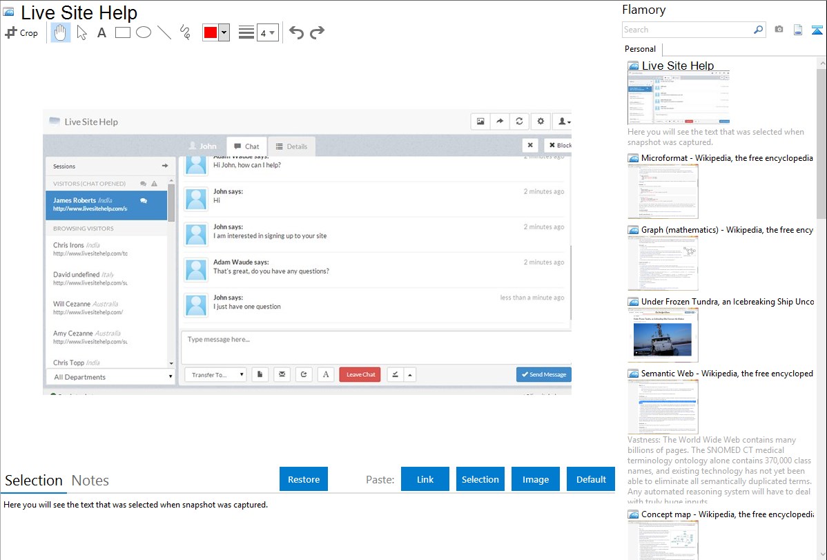 Flamory helps you capture and store screenshots from Live Site Help by pressing a single hotkey. It will be saved to a history, so you can continue doing your tasks without interruptions. Later, you can edit the screenshot: crop, resize, add labels and highlights. After that, you can paste the screenshot into any other document or e-mail message.