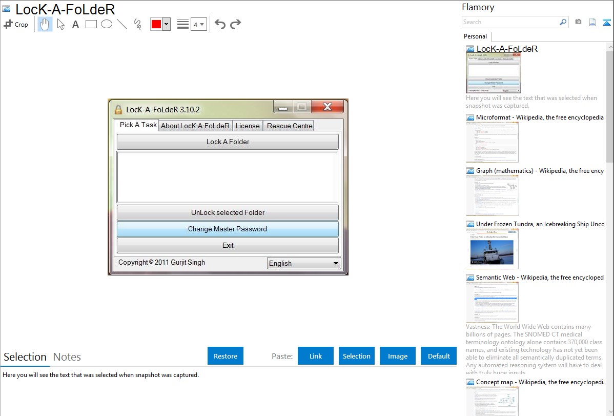 Flamory helps you capture and store screenshots from LocK-A-FoLdeR by pressing a single hotkey. It will be saved to a history, so you can continue doing your tasks without interruptions. Later, you can edit the screenshot: crop, resize, add labels and highlights. After that, you can paste the screenshot into any other document or e-mail message.