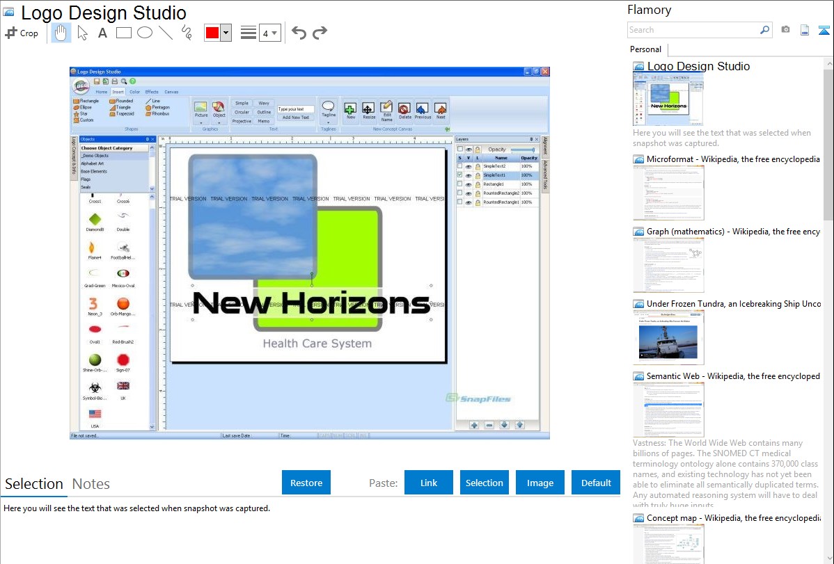 Flamory helps you capture and store screenshots from Logo Design Studio by pressing a single hotkey. It will be saved to a history, so you can continue doing your tasks without interruptions. Later, you can edit the screenshot: crop, resize, add labels and highlights. After that, you can paste the screenshot into any other document or e-mail message.