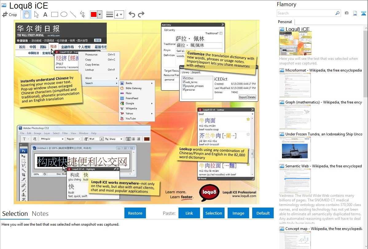 Learn Chinese faster with Loqu8 iCE (iNterpret Chinese-English). Read and understand popular Chinese websites, email and documents using iCEs popup window. Supports simplified and traditional Chinese, Pinyin and Bopomofo. Dictionary has over 96,000 entries including idioms, slang, company names, product names.