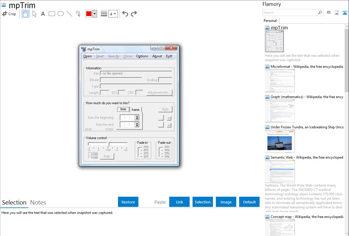 Flamory helps you capture and store screenshots from mpTrim by pressing a single hotkey. It will be saved to a history, so you can continue doing your tasks without interruptions. Later, you can edit the screenshot: crop, resize, add labels and highlights. After that, you can paste the screenshot into any other document or e-mail message.