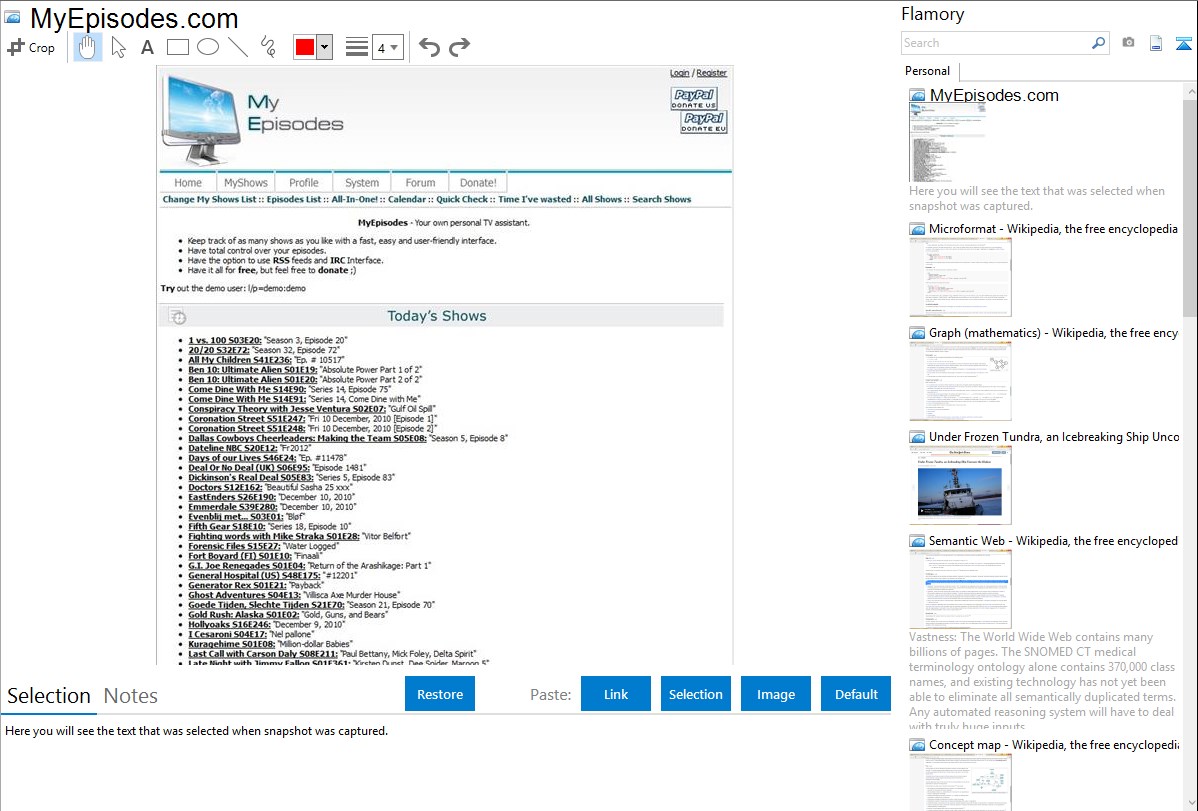 Flamory helps you capture and store screenshots from MyEpisodes.com by pressing a single hotkey. It will be saved to a history, so you can continue doing your tasks without interruptions. Later, you can edit the screenshot: crop, resize, add labels and highlights. After that, you can paste the screenshot into any other document or e-mail message.