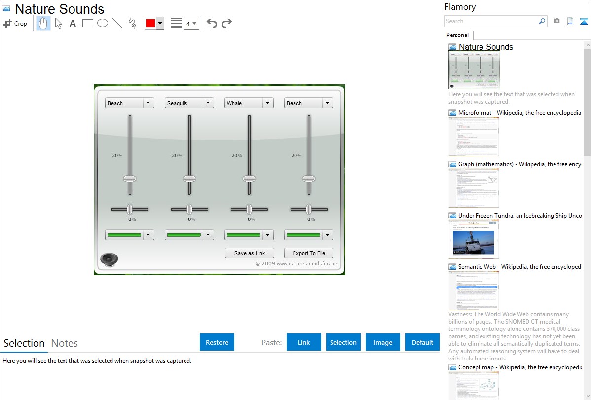 Flamory provides advanced bookmarking for Nature Sounds. It captures screen, selection, text on the page and other context. You can find this bookmark later using search by page content or looking through thumbnail list.