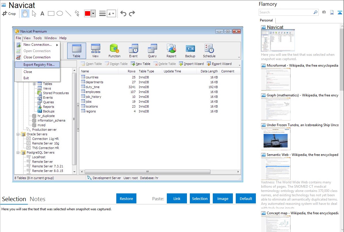 Flamory helps you capture and store screenshots from Navicat by pressing a single hotkey. It will be saved to a history, so you can continue doing your tasks without interruptions. Later, you can edit the screenshot: crop, resize, add labels and highlights. After that, you can paste the screenshot into any other document or e-mail message.