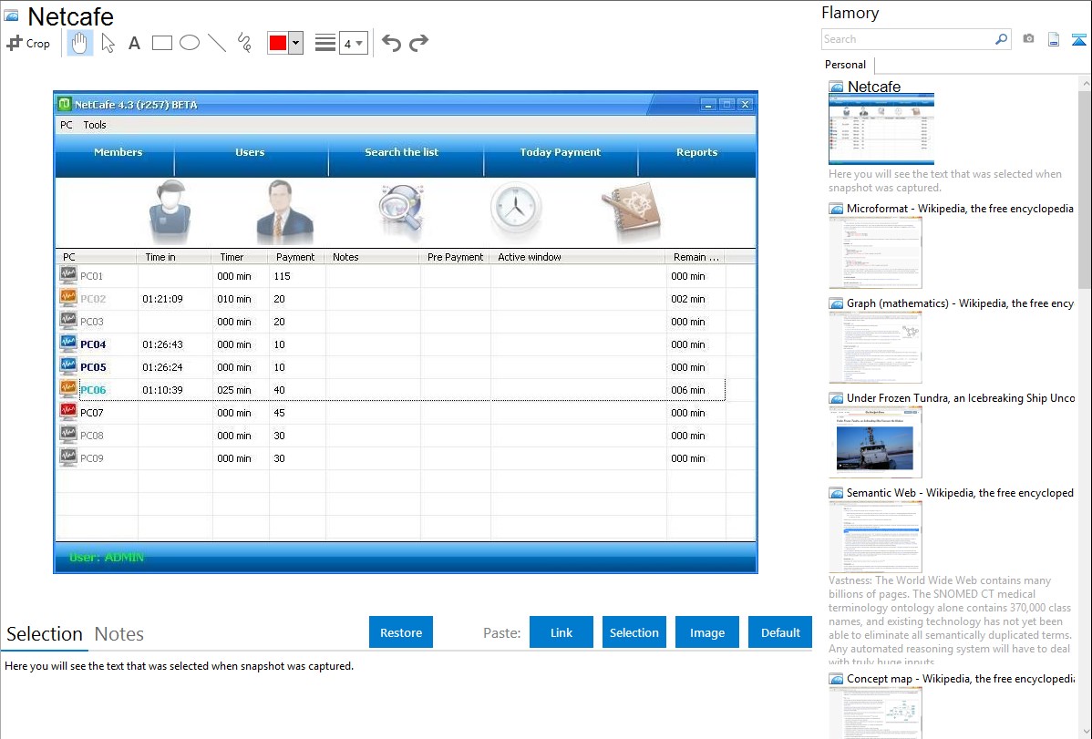 Flamory helps you capture and store screenshots from Netcafe by pressing a single hotkey. It will be saved to a history, so you can continue doing your tasks without interruptions. Later, you can edit the screenshot: crop, resize, add labels and highlights. After that, you can paste the screenshot into any other document or e-mail message.