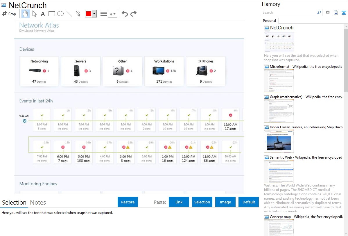 Flamory helps you capture and store screenshots from NetCrunch by pressing a single hotkey. It will be saved to a history, so you can continue doing your tasks without interruptions. Later, you can edit the screenshot: crop, resize, add labels and highlights. After that, you can paste the screenshot into any other document or e-mail message.