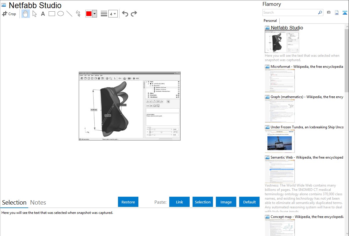 Flamory helps you capture and store screenshots from Netfabb Studio by pressing a single hotkey. It will be saved to a history, so you can continue doing your tasks without interruptions. Later, you can edit the screenshot: crop, resize, add labels and highlights. After that, you can paste the screenshot into any other document or e-mail message.