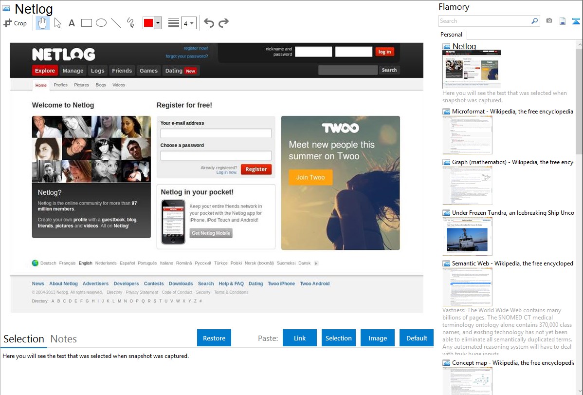 Flamory helps you capture and store screenshots from Netlog by pressing a single hotkey. It will be saved to a history, so you can continue doing your tasks without interruptions. Later, you can edit the screenshot: crop, resize, add labels and highlights. After that, you can paste the screenshot into any other document or e-mail message.