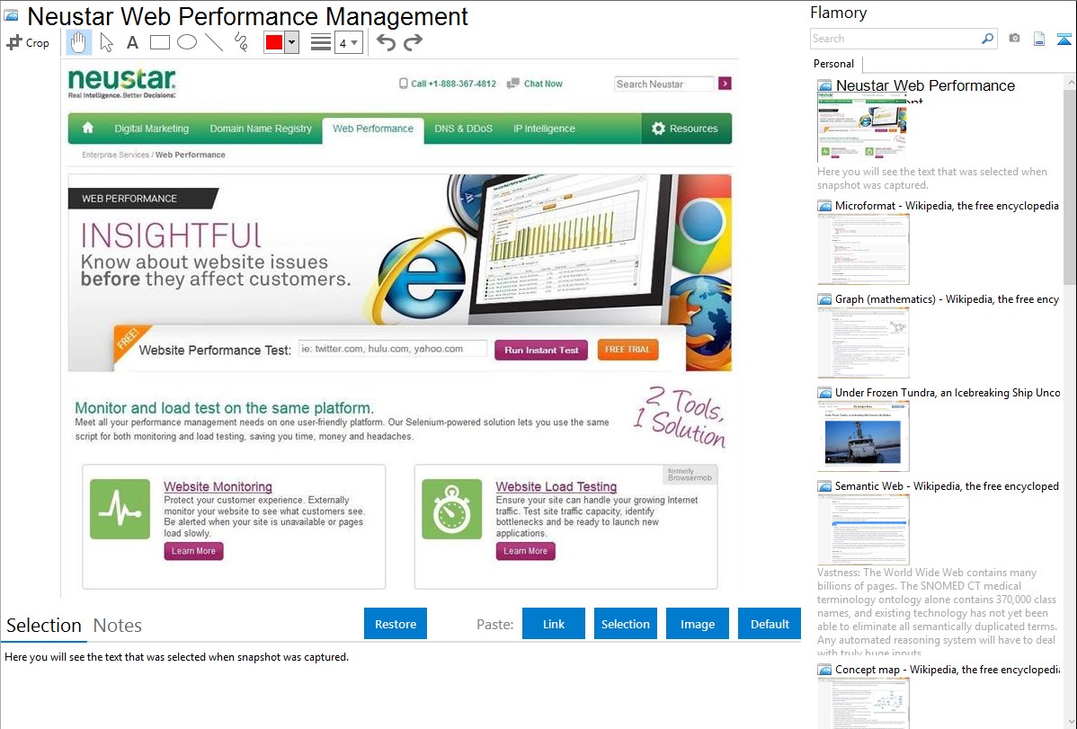 Flamory helps you capture and store screenshots from Neustar Web Performance Management by pressing a single hotkey. It will be saved to a history, so you can continue doing your tasks without interruptions. Later, you can edit the screenshot: crop, resize, add labels and highlights. After that, you can paste the screenshot into any other document or e-mail message.