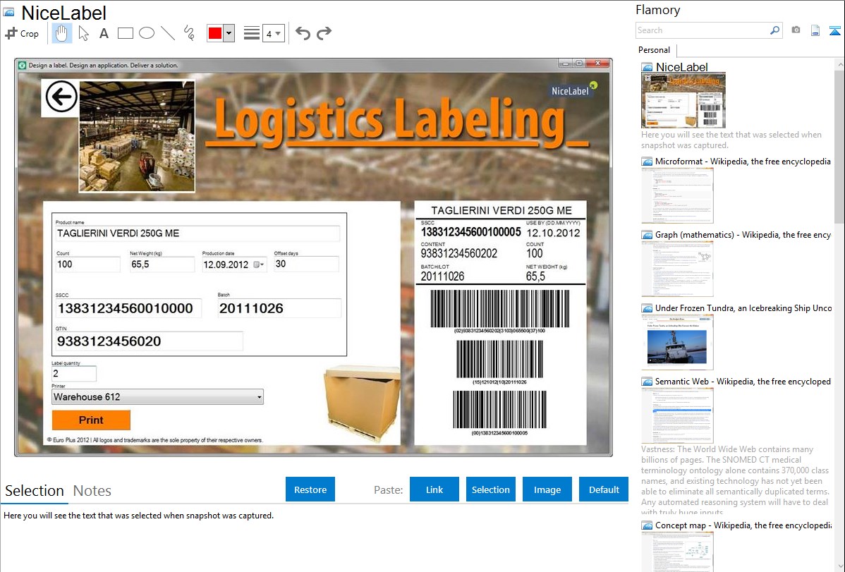 Flamory helps you capture and store screenshots from NiceLabel by pressing a single hotkey. It will be saved to a history, so you can continue doing your tasks without interruptions. Later, you can edit the screenshot: crop, resize, add labels and highlights. After that, you can paste the screenshot into any other document or e-mail message.
