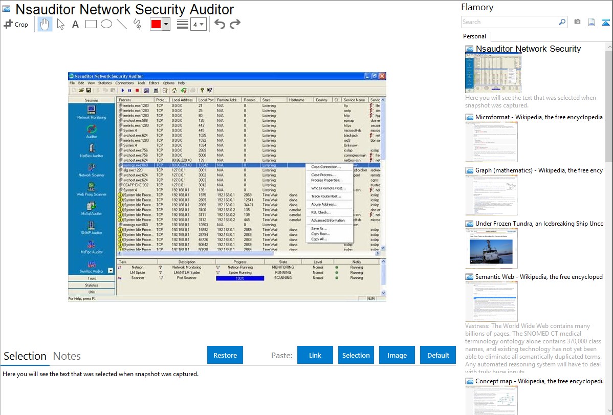 Flamory helps you capture and store screenshots from Nsauditor Network Security Auditor by pressing a single hotkey. It will be saved to a history, so you can continue doing your tasks without interruptions. Later, you can edit the screenshot: crop, resize, add labels and highlights. After that, you can paste the screenshot into any other document or e-mail message.