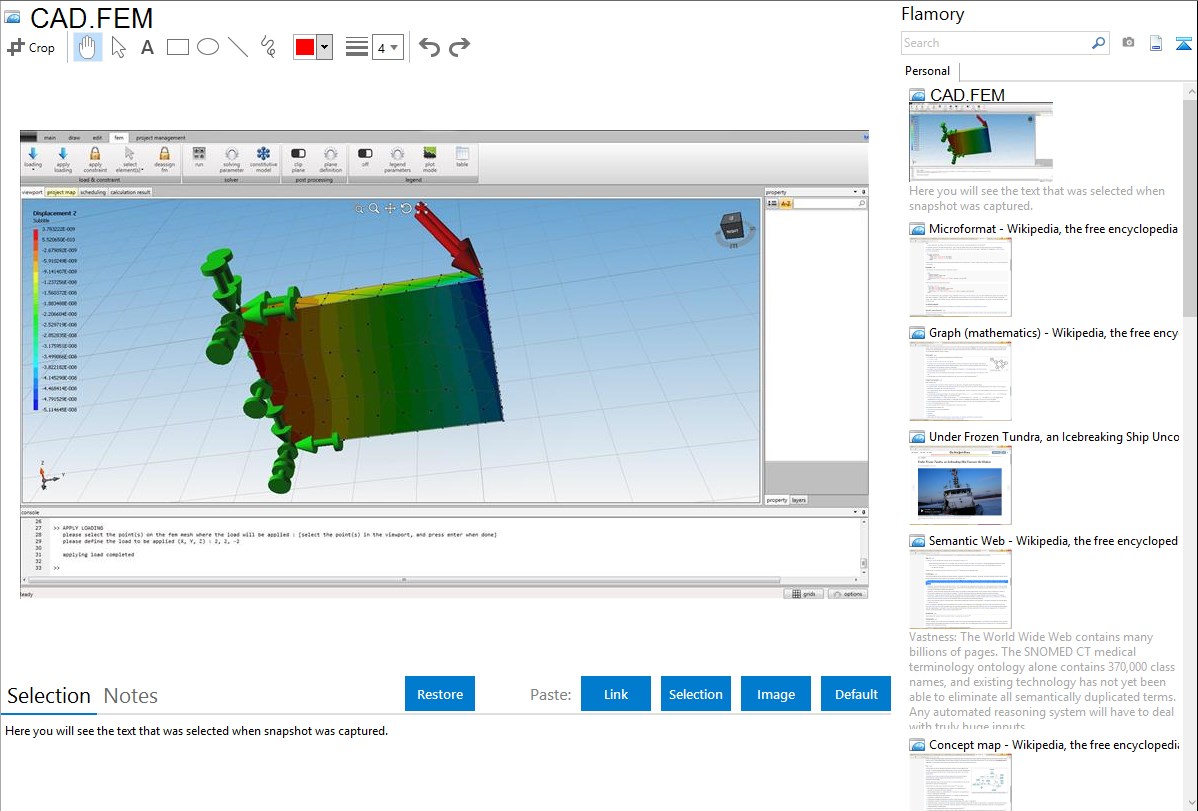 Flamory helps you capture and store screenshots from CAD.FEM by pressing a single hotkey. It will be saved to a history, so you can continue doing your tasks without interruptions. Later, you can edit the screenshot: crop, resize, add labels and highlights. After that, you can paste the screenshot into any other document or e-mail message.