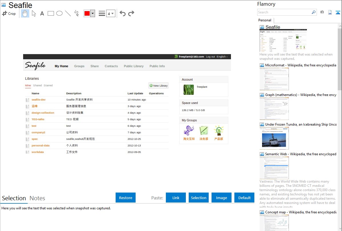 Flamory helps you capture and store screenshots from Seafile by pressing a single hotkey. It will be saved to a history, so you can continue doing your tasks without interruptions. Later, you can edit the screenshot: crop, resize, add labels and highlights. After that, you can paste the screenshot into any other document or e-mail message.