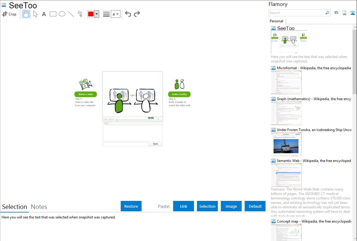 Flamory helps you capture and store screenshots from SeeToo by pressing a single hotkey. It will be saved to a history, so you can continue doing your tasks without interruptions. Later, you can edit the screenshot: crop, resize, add labels and highlights. After that, you can paste the screenshot into any other document or e-mail message.