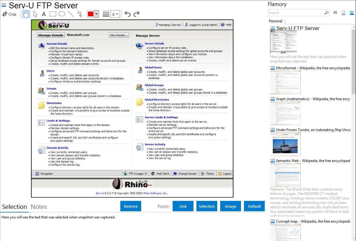 Flamory helps you capture and store screenshots from Serv-U FTP Server by pressing a single hotkey. It will be saved to a history, so you can continue doing your tasks without interruptions. Later, you can edit the screenshot: crop, resize, add labels and highlights. After that, you can paste the screenshot into any other document or e-mail message.