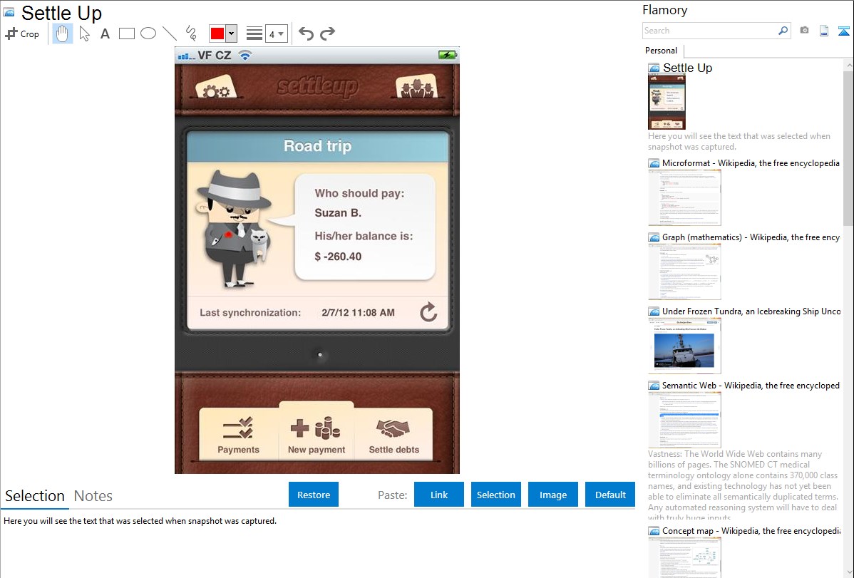 Flamory helps you capture and store screenshots from Settle Up by pressing a single hotkey. It will be saved to a history, so you can continue doing your tasks without interruptions. Later, you can edit the screenshot: crop, resize, add labels and highlights. After that, you can paste the screenshot into any other document or e-mail message.