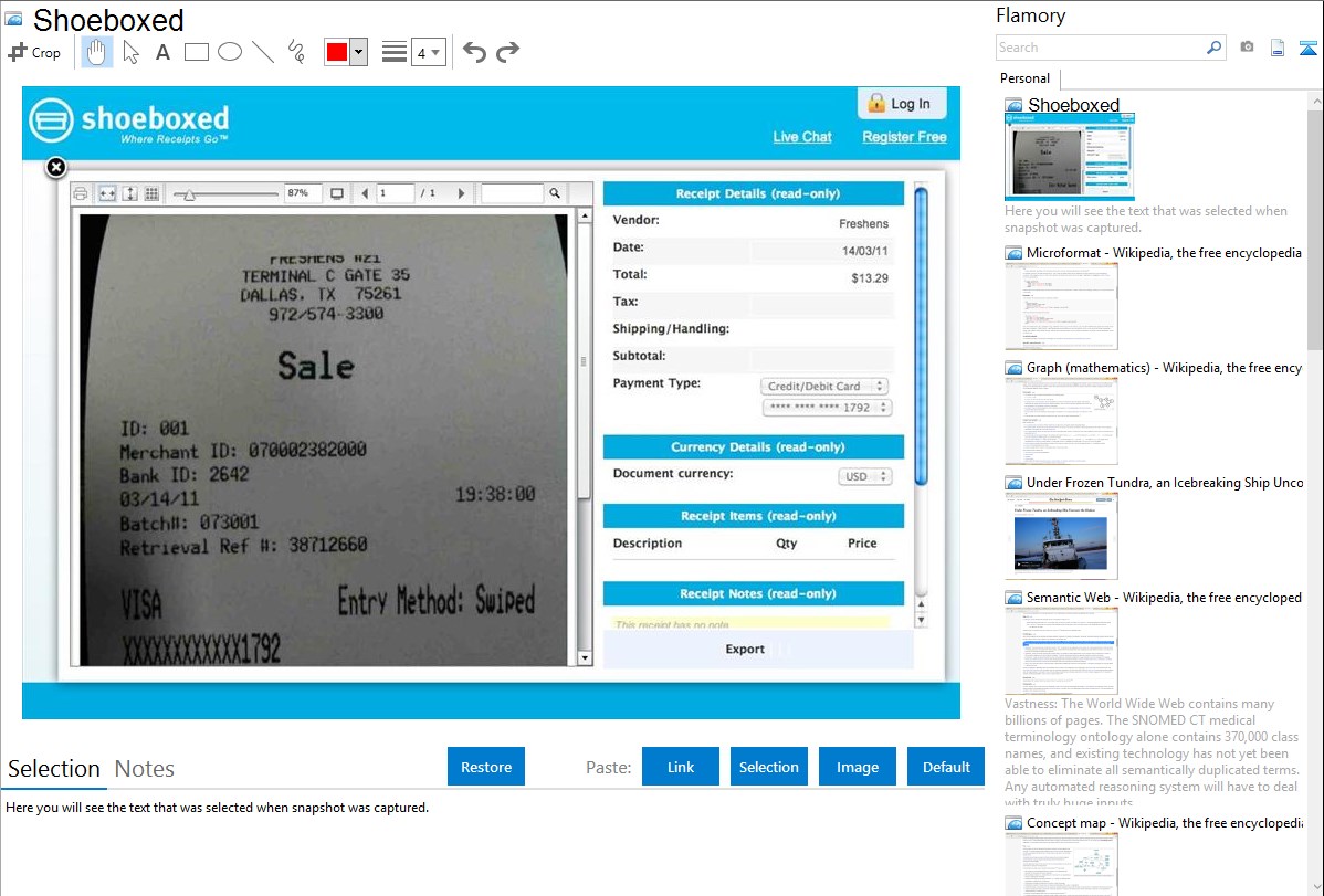 Flamory helps you capture and store screenshots from Shoeboxed by pressing a single hotkey. It will be saved to a history, so you can continue doing your tasks without interruptions. Later, you can edit the screenshot: crop, resize, add labels and highlights. After that, you can paste the screenshot into any other document or e-mail message.