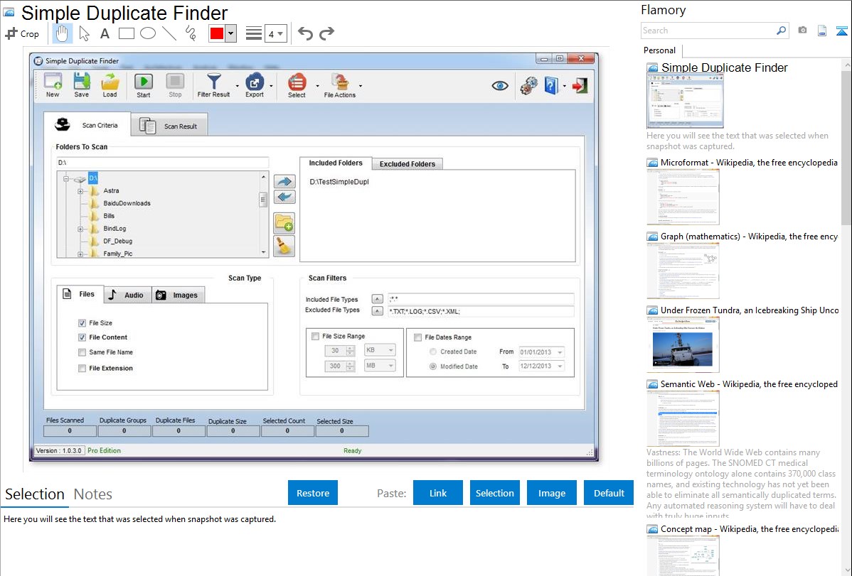 Flamory helps you capture and store screenshots from Simple Duplicate Finder by pressing a single hotkey. It will be saved to a history, so you can continue doing your tasks without interruptions. Later, you can edit the screenshot: crop, resize, add labels and highlights. After that, you can paste the screenshot into any other document or e-mail message.