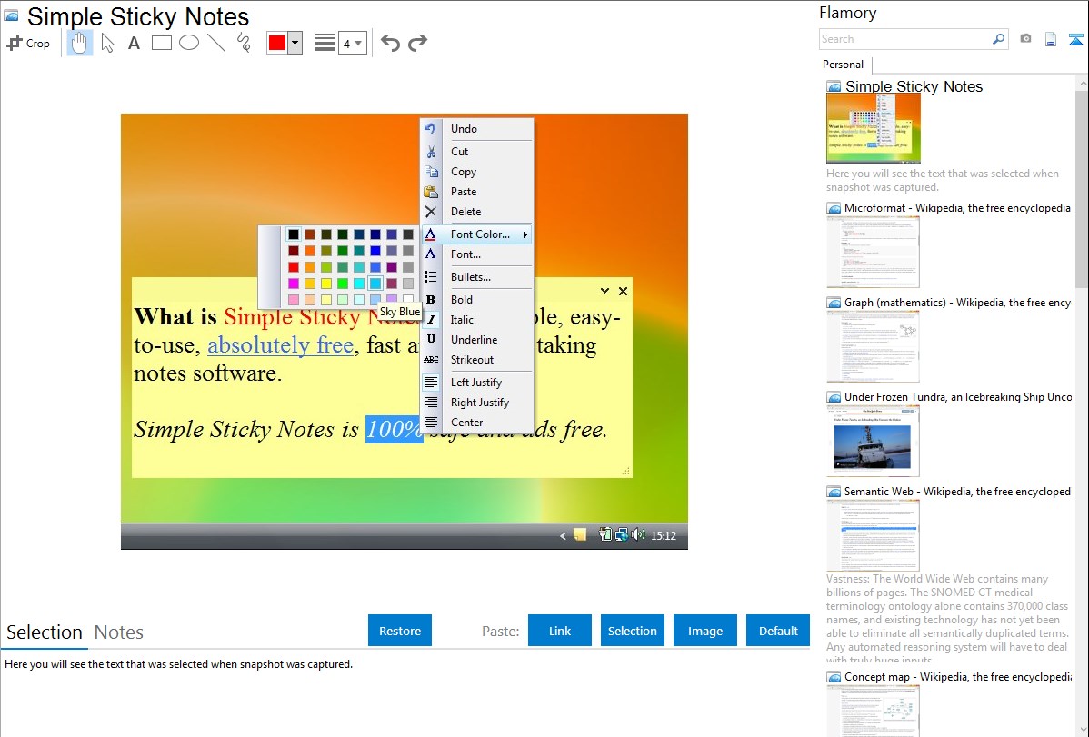 Flamory helps you capture and store screenshots from Simple Sticky Notes by pressing a single hotkey. It will be saved to a history, so you can continue doing your tasks without interruptions. Later, you can edit the screenshot: crop, resize, add labels and highlights. After that, you can paste the screenshot into any other document or e-mail message.