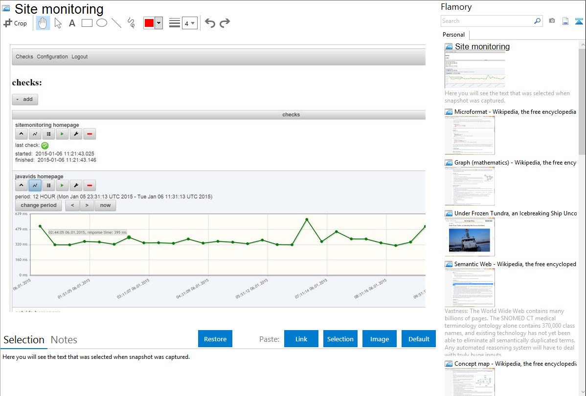 Flamory helps you capture and store screenshots from Site monitoring by pressing a single hotkey. It will be saved to a history, so you can continue doing your tasks without interruptions. Later, you can edit the screenshot: crop, resize, add labels and highlights. After that, you can paste the screenshot into any other document or e-mail message.