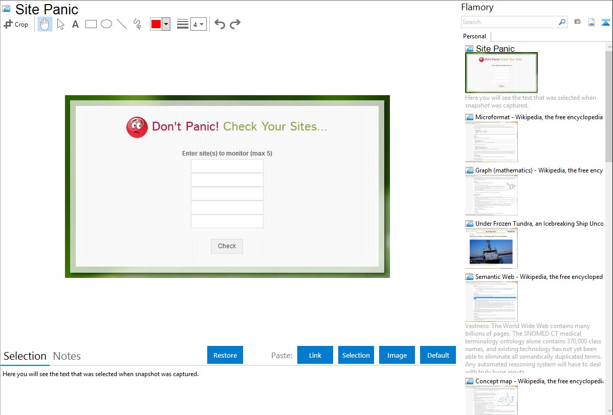 Flamory helps you capture and store screenshots from Site Panic by pressing a single hotkey. It will be saved to a history, so you can continue doing your tasks without interruptions. Later, you can edit the screenshot: crop, resize, add labels and highlights. After that, you can paste the screenshot into any other document or e-mail message.