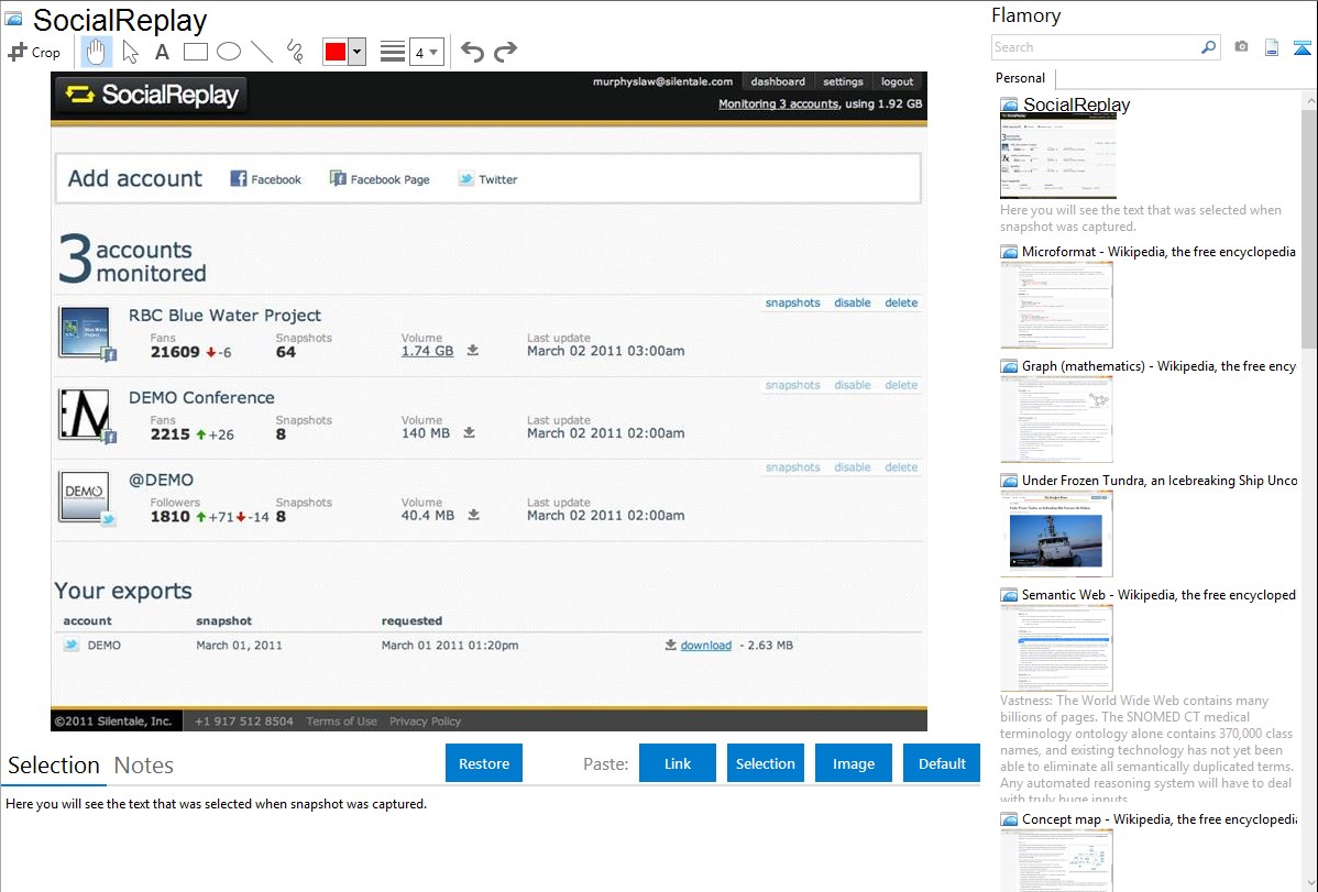 Flamory helps you capture and store screenshots from SocialReplay by pressing a single hotkey. It will be saved to a history, so you can continue doing your tasks without interruptions. Later, you can edit the screenshot: crop, resize, add labels and highlights. After that, you can paste the screenshot into any other document or e-mail message.