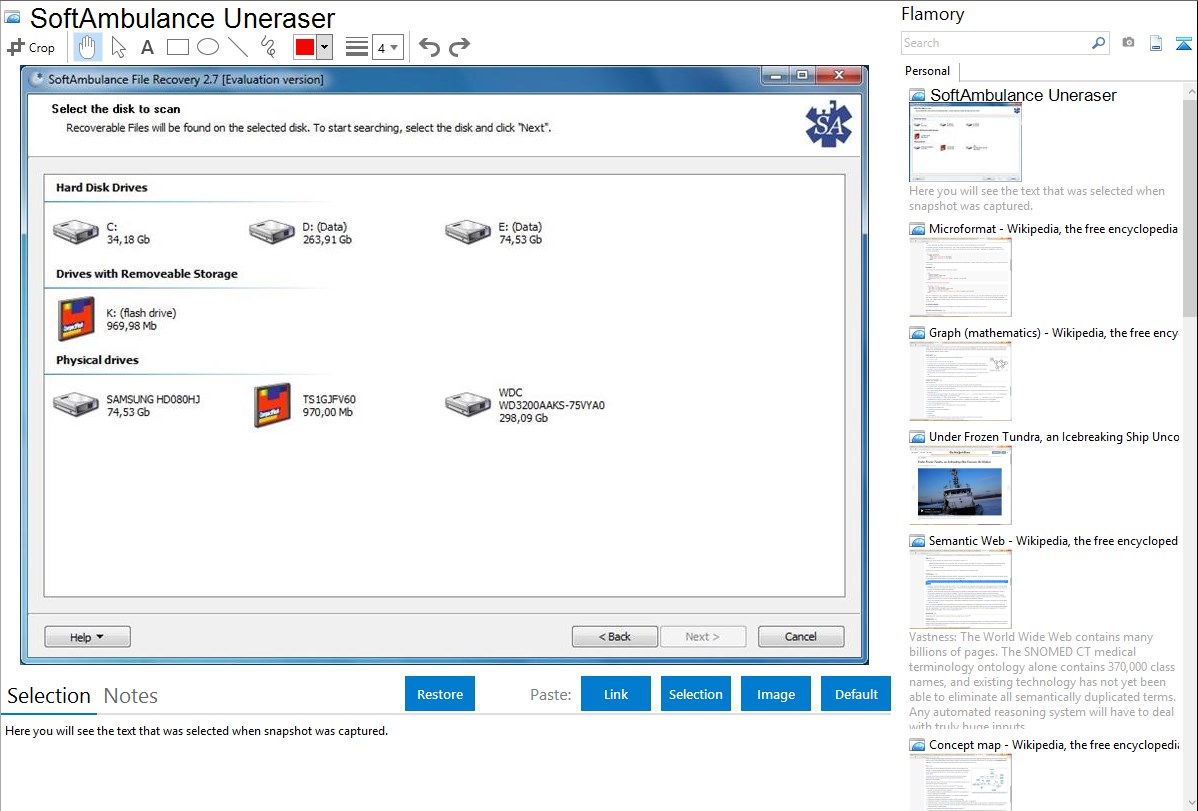 Flamory helps you capture and store screenshots from SoftAmbulance Uneraser by pressing a single hotkey. It will be saved to a history, so you can continue doing your tasks without interruptions. Later, you can edit the screenshot: crop, resize, add labels and highlights. After that, you can paste the screenshot into any other document or e-mail message.