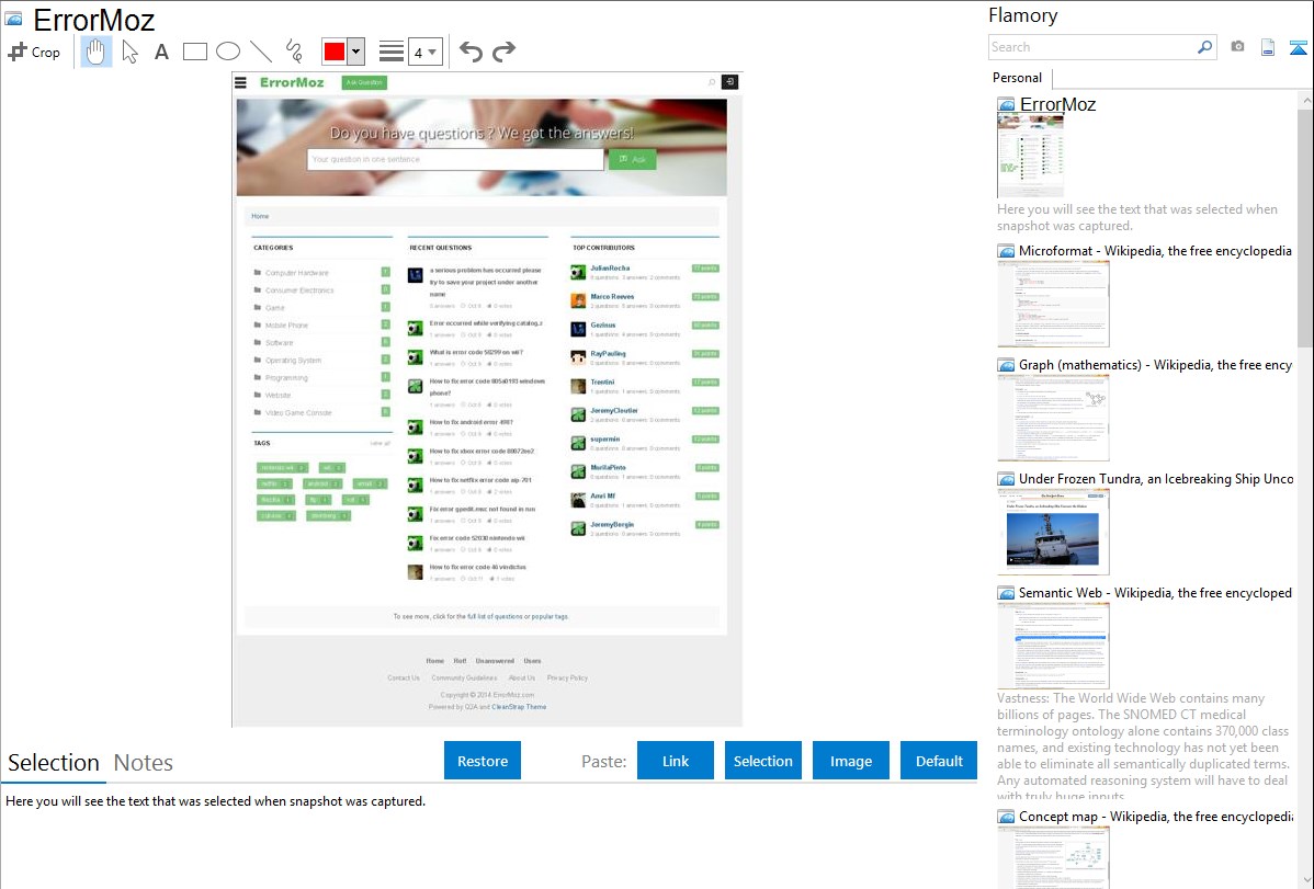 Flamory helps you capture and store screenshots from ErrorMoz by pressing a single hotkey. It will be saved to a history, so you can continue doing your tasks without interruptions. Later, you can edit the screenshot: crop, resize, add labels and highlights. After that, you can paste the screenshot into any other document or e-mail message.