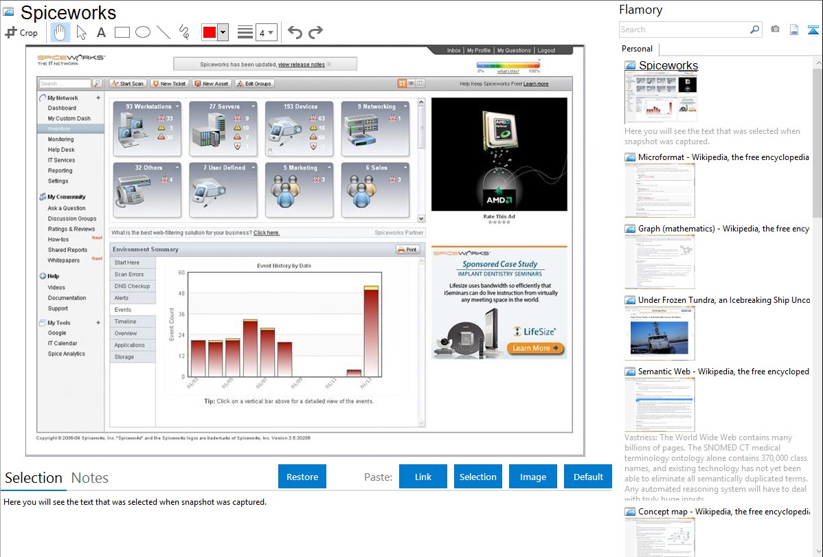 Flamory helps you capture and store screenshots from Spiceworks by pressing a single hotkey. It will be saved to a history, so you can continue doing your tasks without interruptions. Later, you can edit the screenshot: crop, resize, add labels and highlights. After that, you can paste the screenshot into any other document or e-mail message.