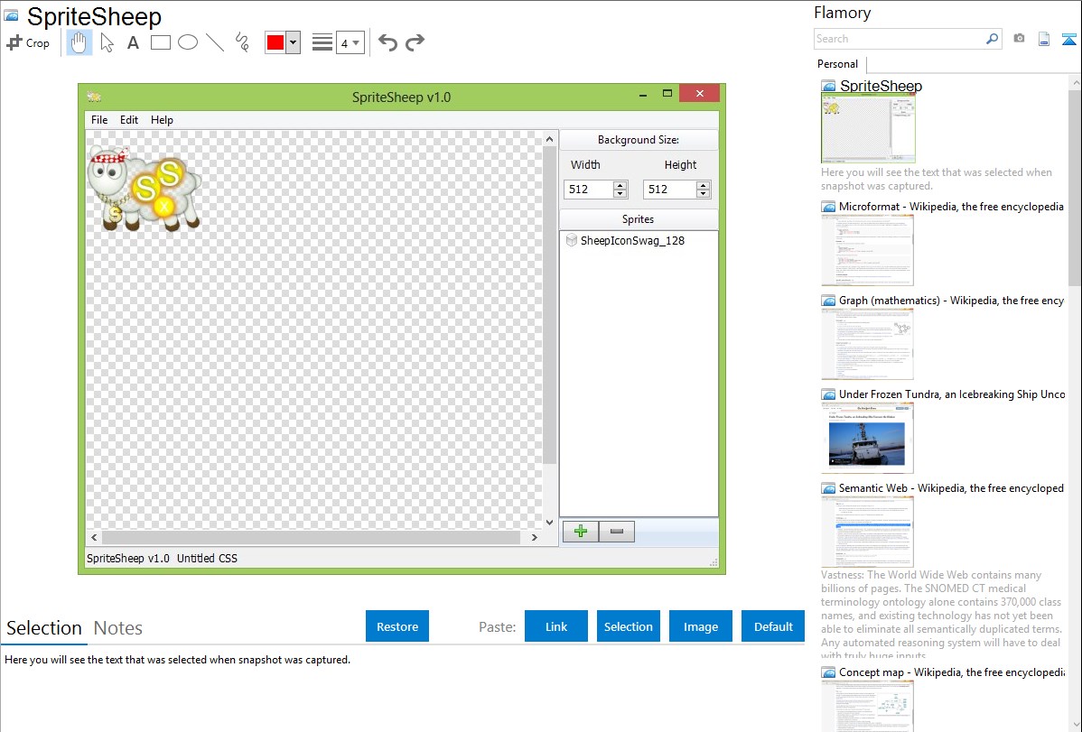 Flamory helps you capture and store screenshots from SpriteSheep by pressing a single hotkey. It will be saved to a history, so you can continue doing your tasks without interruptions. Later, you can edit the screenshot: crop, resize, add labels and highlights. After that, you can paste the screenshot into any other document or e-mail message.