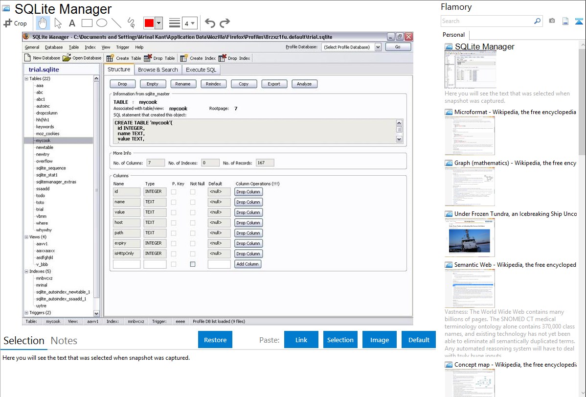 Flamory helps you capture and store screenshots from SQLite Manager by pressing a single hotkey. It will be saved to a history, so you can continue doing your tasks without interruptions. Later, you can edit the screenshot: crop, resize, add labels and highlights. After that, you can paste the screenshot into any other document or e-mail message.