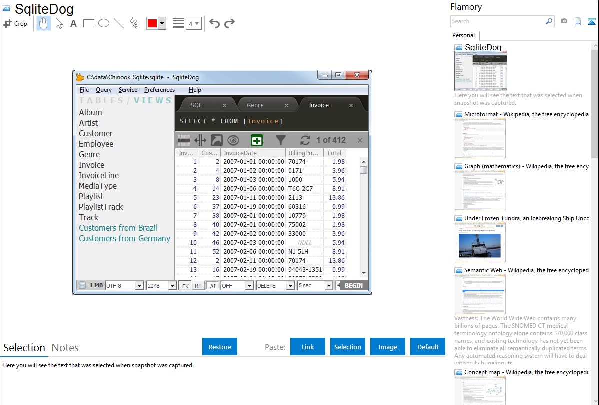 Flamory helps you capture and store screenshots from SqliteDog by pressing a single hotkey. It will be saved to a history, so you can continue doing your tasks without interruptions. Later, you can edit the screenshot: crop, resize, add labels and highlights. After that, you can paste the screenshot into any other document or e-mail message.