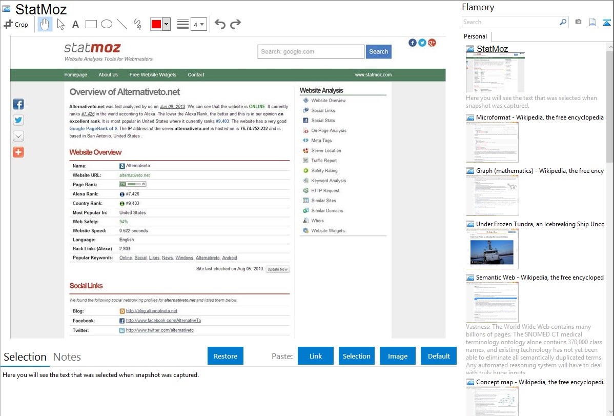 Flamory helps you capture and store screenshots from StatMoz by pressing a single hotkey. It will be saved to a history, so you can continue doing your tasks without interruptions. Later, you can edit the screenshot: crop, resize, add labels and highlights. After that, you can paste the screenshot into any other document or e-mail message.