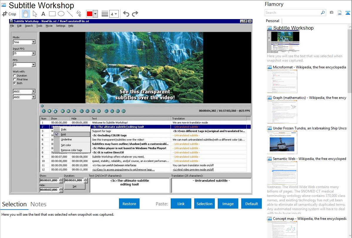 Flamory provides advanced bookmarking for Subtitle Workshop. It captures screen, selection, text of the document and other context. You can find this bookmark later using search by document content or looking through thumbnail list.