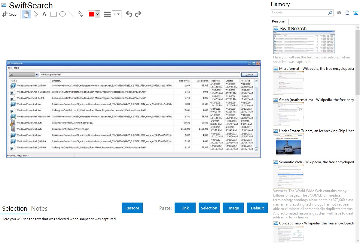 Flamory helps you capture and store screenshots from SwiftSearch by pressing a single hotkey. It will be saved to a history, so you can continue doing your tasks without interruptions. Later, you can edit the screenshot: crop, resize, add labels and highlights. After that, you can paste the screenshot into any other document or e-mail message.