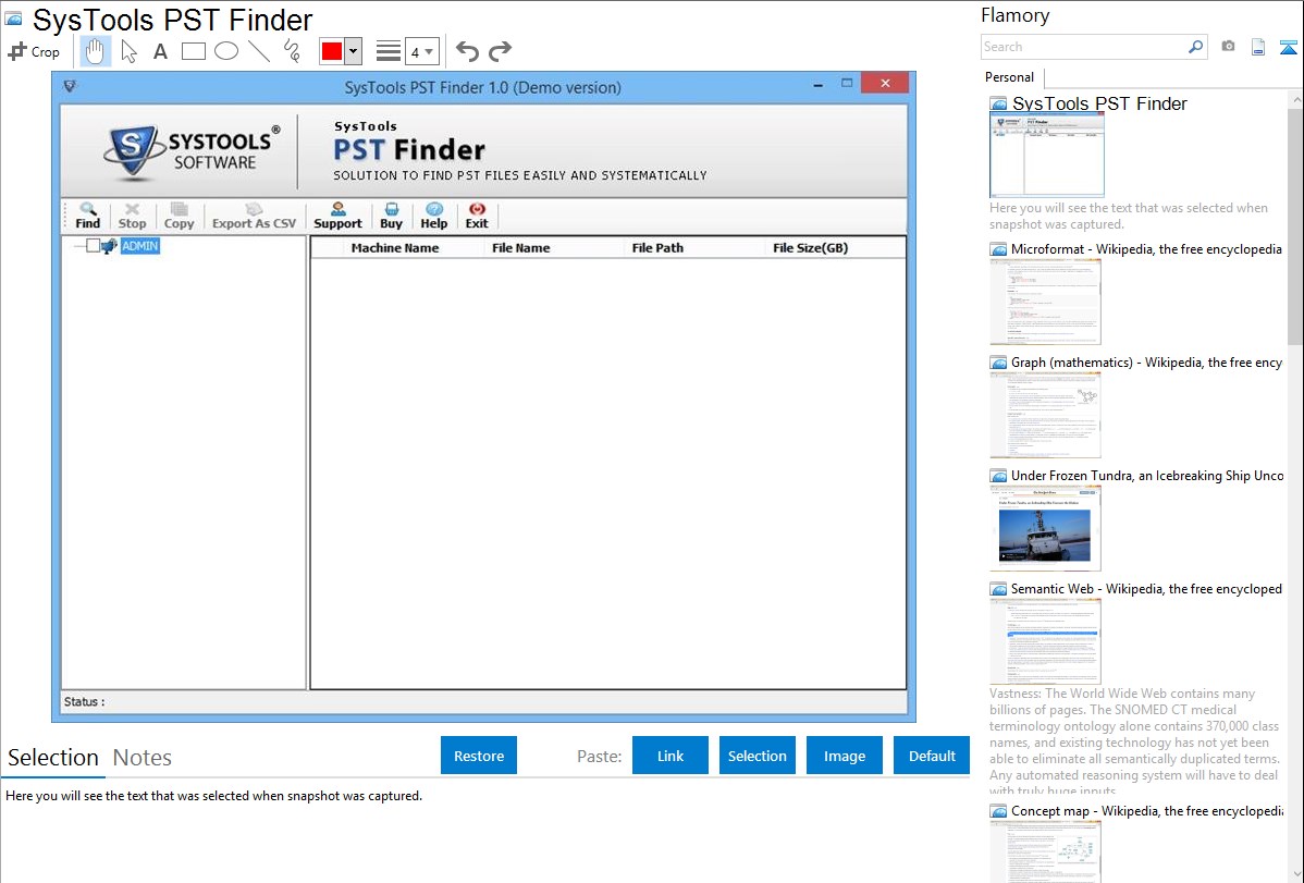 Flamory helps you capture and store screenshots from SysTools PST Finder by pressing a single hotkey. It will be saved to a history, so you can continue doing your tasks without interruptions. Later, you can edit the screenshot: crop, resize, add labels and highlights. After that, you can paste the screenshot into any other document or e-mail message.