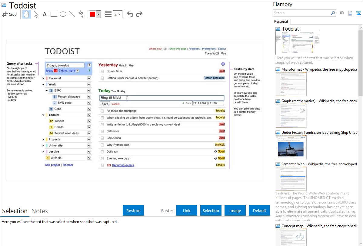 Flamory helps you capture and store screenshots from Todoist by pressing a single hotkey. It will be saved to a history, so you can continue doing your tasks without interruptions. Later, you can edit the screenshot: crop, resize, add labels and highlights. After that, you can paste the screenshot into any other document or e-mail message.