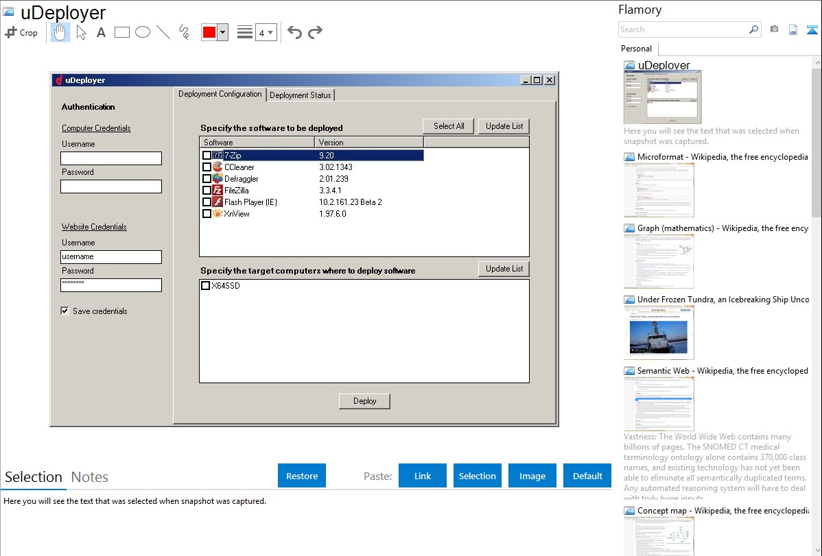 Flamory helps you capture and store screenshots from uDeployer by pressing a single hotkey. It will be saved to a history, so you can continue doing your tasks without interruptions. Later, you can edit the screenshot: crop, resize, add labels and highlights. After that, you can paste the screenshot into any other document or e-mail message.