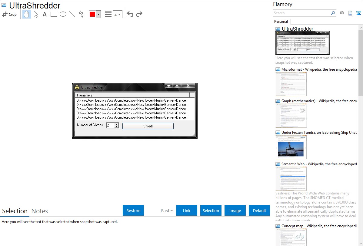 Flamory helps you capture and store screenshots from UltraShredder by pressing a single hotkey. It will be saved to a history, so you can continue doing your tasks without interruptions. Later, you can edit the screenshot: crop, resize, add labels and highlights. After that, you can paste the screenshot into any other document or e-mail message.